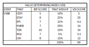 Dulverton Valhalla V088 registers a Value Determining Index (VDI) of 69, see Chaps Chatter on Dulverton website for detail. Had he of scored 70, he would have been retained for Stud duty.